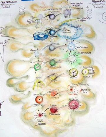 Also known as Visual Facilitation (and by other terms), this body of work includes large-scale panels completed in real time to capture conversations with visual language (words, images, symbols). This work includes deep listening, consolidation of complex information represented in appropriate hierarchies, working under time pressure on a stage in front of, sometimes, hundreds of people, and, of course, drawing and lettering. These panels are often at least 4 x 8 feet large, and reflect, on average, a two-hour conversation. Materials used are soft pastels and markers.